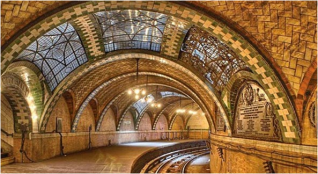 The City Hall subway stop on the 6 line closed in 1945 as it could not be modernized. We can sneak a glimpse of this station if we stay on the 6 train towards downtown after the last stop, as it passes through the station when it loops around to the uptown platform [2].The three major types of artworks on subway