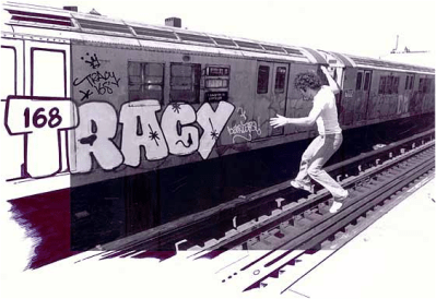 TRACY 168, who began writing graffiti in the late sixties and invented wild style in the mid-seventies, painted this train in two minutes in 1974. Afterward, he added ink and whiteout to the photo [8].