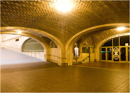 In an underpass below Grand Central station, the arched walls allow the sound travel across the domed ceiling allowing two people to hear each other whisper when they stand at diagonal arches [2].