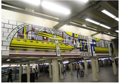 This brightly colored masterpiece stretches 6-feet high and 53-feet long inside the entrance of 42nd Street and Broadway in the Time Square subway station. Created by Roy Lichtenstein in 2002, the mural celebrates the history of New York City transit by featuring visionary images of masonry, machines and modernism [6].