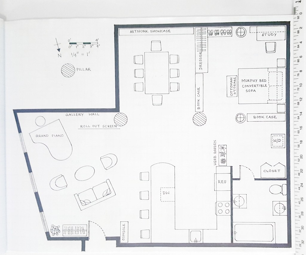 The “before photographs” shown above are of the space. As this project is for education purpose and not for profit, I used the photographs available on public domain. Located in lower Manhattan, New York City, this is a open concept loft studio space of 1000 square feet that should transform into kitchen, dining, study, sleeping, living, working out or entertaining guests based on the situation. The clients are moving to this new loft, very typical pre-war buildings of the neighborhood. They need separate space for activities in case each person is doing something different. They don’t like the existing colonial style wood work.