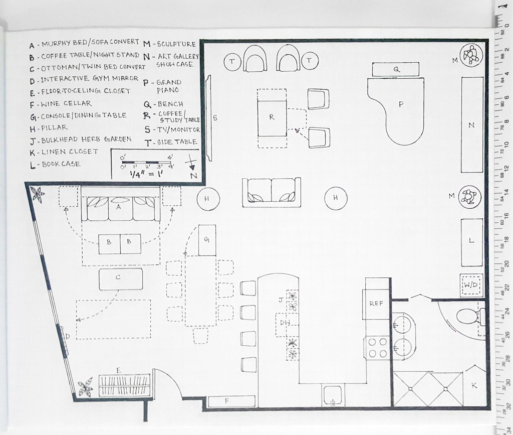 1) The king size Murphy bed/sofa convertible can be used for living or sleeping based on the need. The side tables when joined can become the a coffee table for the sofa or when kept at two sides can serve as night stands. The ottoman can provide additional seating or when expanded can become a twin guest bed. A thin screen can create a temporary guest sleeping area providing privacy. This is further explained in the scale elevation plan.