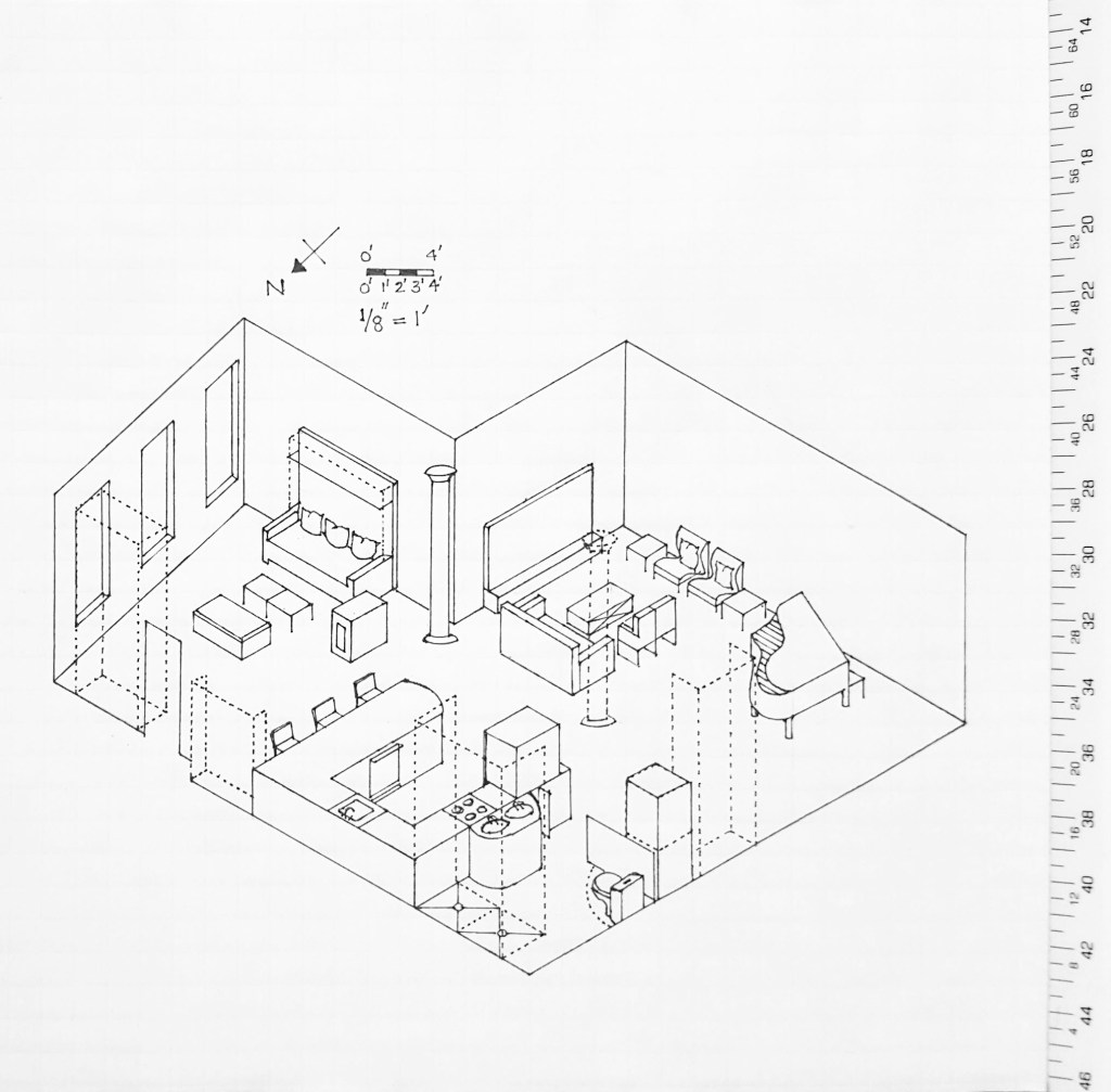 Layout 1 is a traditional concept with large furniture pieces and open airy space. But, the lack of multi-purpose furniture limits the space from entertaining many visitors and carrying out many activities at once. Layout 2 tries to incorporate some modern furniture concepts but ends up making the space too cramped. There are not enough space to move around the big furniture pieces. The formal dining room, although is an ode to the classic style, with frequent travel lifestyle of the clients, it will just sit there gathering dust. Finally, the only windows in this loft are on the East wall and utilizing the natural light without blocking it with any big furniture is a good choice. Layout 3 solves all of these design problems with clever use of multi-purpose fold-able/extendable furniture and equally versatile light fixtures that can transform the space according to the clients’ different activities.