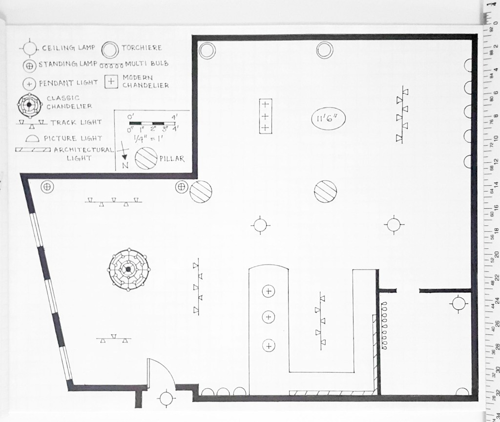 As the design incorporates both classic and contemporary styles, electrical fixtures are chosen accordingly. The entrance room has a classic chandelier placed right in the middle (Please see reflected ceiling plan) which in combination with classic marble sculptures placed above the sofa bed create a transitional style. The sleek design of the modern sofa/bed convertible, tables and contemporary standing lamps add to this. On the contrary a modern chandelier with LED dimmer lights is placed in the TV room which can work as a downward task light as the coffee table converts to a study table. Plenty of track lights were also installed throughout the loft to use their versatility according to ambience, task or accent lighting.