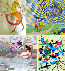 In 2016, Dallas, these four artists teamed up realizing their common interest in telling magical stories from around the world and in the process inspiring their audience to share their own stories in visual and literary art. Just like the magical objects in their stories, they plan to utilize paintings, sculptures and storytelling in their workshops to bring out the magical creativity in their audience. Elisabeth’s paintings and story “Markel the Magnificent” (Figure 5, top left) shows how each audience as an individual has the magical ability to bring someone back to life. Caroline’s visuals and writing on “God Quest” (Figure 5, top right) encourages creative thinking and imagination of the audience in finding their inner peace. Shafaq’s paintings and sculptures on “Conference of birds” (Figure 5, bottom right) inspires deep thinking, compassion and will lift the spirit of the audience in pursuing their own creative art form. Dhru’s paintings and story “The gold wand and the silver wand” (Figure 5, bottom left) establishes the audience as heroes who look for ways and means to overcome demon-like diseases in their own lives and in the process shares their own story in visual and literary art. Together these four artists from four corners of the world show the audience that no matter where they are from and where they are now in life, everyone has a story worth telling and if we don’t tell our stories, no one else will.