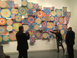 8000 miles away from Caroline, was Shafaq. Born in Rawalpindi, Pakistan, Shafaq has always been drawn to mysticism. She lived in United Kingdom, Iran and Denmark before fully realizing her artistic purpose and settling down in United States. Over past few decades she wore and switched several hats: a BFA student of Virginia Commonwealth University, Richmond, an MFA student of Texas Christian University, Fort Worth, a glass artist collaborating with galleries in Czech Republic and Sweden, and a multimedia artist with many solo and 70 group exhibitions all around the world. Her most impactful work involving interaction with audience and inspiring them was with the Minister of Art and Education at Sharjah, United Arab Emirates (Figure 3). Her work in connecting the contemporary calligraphy presenting mysterious letters, realm of hidden geometric and fractal patterns impacted the audience to create their own form of art and shaped the future of art educational programs in United Arab Emirates. Recently, Deborah Fleck from Dallas Morning News writes about her solo exhibition – “For big, bold and colorful see the paintings of Shafaq Ahmad.”
