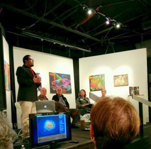 Born in 1980’s Kolkata, India, Dhru had a dream of merging art and science. Just like the North East Indian folklore of “Grandmother’s tales” he flew over thirteen rivers and seven mountains to reach Dallas, Texas. His PhD studies in biomedical science At UT Southwestern Medical Center, Dallas and BA studies in visual art at University of Hertfordshire, UK, enabled him to communicate complex problems of science via art to a broader audience and to be involved in transforming the education in both elementary (The Hockaday School) and higher level (Center for Art and Technology, UTD). The most impactful of his interactions was at the LuminArte Gallery, Dallas (Figure 4), where he curated and participated in an art show with 50 artworks from 6 artists and scientists and a panel discussion with 2 scientists and 2 artists. This educational event enabled an exchange of knowledge and inspiration to create art of science among 140 audience members. Priscilla Di Thiene, Editor of Le Scienze from Rome recalls “Our magazine deals with a lot of scientific arguments. But, your images published in Le Scienze show such a different way to see, study, understand and approach cancer.”